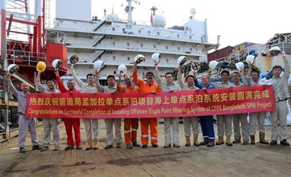 পূর্ব বঙ্গোপসাগরে চট্টগ্রাম বন্দরের প্রবেশপথে, চীনা প্রকৌশল দলের সদস্যরা এবং লাল রঙের পোশাক পরা স্থানীয় কর্মীরা বাংলাদেশের প্রথম সমুদ্র-ভূমি সমন্বিত অতি-বৃহৎ তেল সঞ্চয় ও পরিবহন প্রকল্প নির্মাণের জন্য নিবিড় ও