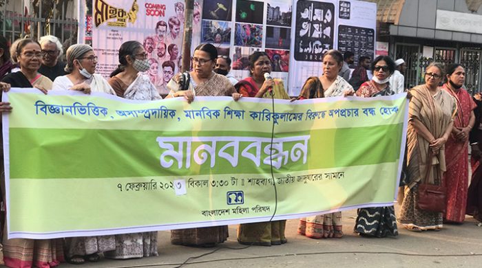 মশিউর আনন্দ: জাতীয় জাদুঘরের সামনে “বিজ্ঞান ভিত্তিক, অসাম্প্রদায়িক, মানবিক শিক্ষা কারিকুলামের বিরুদ্ধে অপপ্রচার বন্ধ করার দাবিতে” বাংলাদেশ মহিলা পরিষদের উদ্যোগে মানববন্ধন কর্মসূচি অনুষ্ঠিত হয়। মানববন্ধন কর্মসূচিতে সভাপতিত্ব করেন সংগঠনের সভাপতি