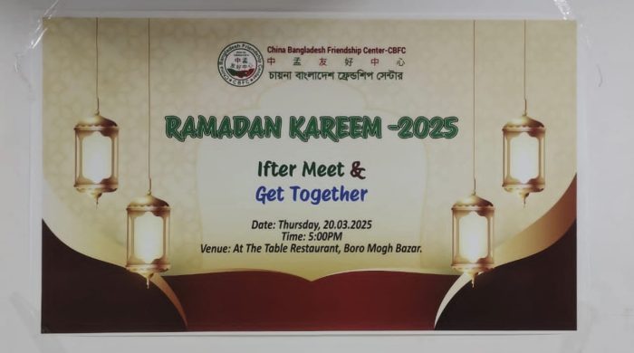 চীন-বাংলাদেশ ফ্রেন্ডশিপ সেন্টার কর্তৃক আয়োজিত ২০ মার্চ ২০২৫, বৃহস্পতিবার, বিকেল ৫:০০টায় “ইফতার মিট অ্যান্ড গেট টুগেদার” অনুষ্ঠানটি সফলভাবে সম্পন্ন করেছে। ইফতার অনুষ্ঠান “অ্যাট দ্য টেবিন” রেস্তোরাঁ,ঢাকার বড় মোগবাজারে অনুষ্ঠিত হয়।